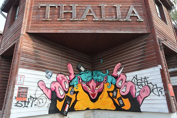 90ndatel tegutsenud kurikuulus kino, mis oli esimene koht Tartus, kus sai VHS kassette laenutada ja koha peal vaadata, on nüüdseks seisnud kasutuseta juba kümneid aastaid. Räämas majale otsustas elu ja värvi lisada Leedu tänavakunstnik Pidžin, kes leidis inspiratsiooni lisaks maja kirjule ajaloole ka nime "Thalia" päritolust - Thaleia on vanakreeka mütoloogia kohaselt Zeusi tütar, muusa ja komöödia kaitsja.